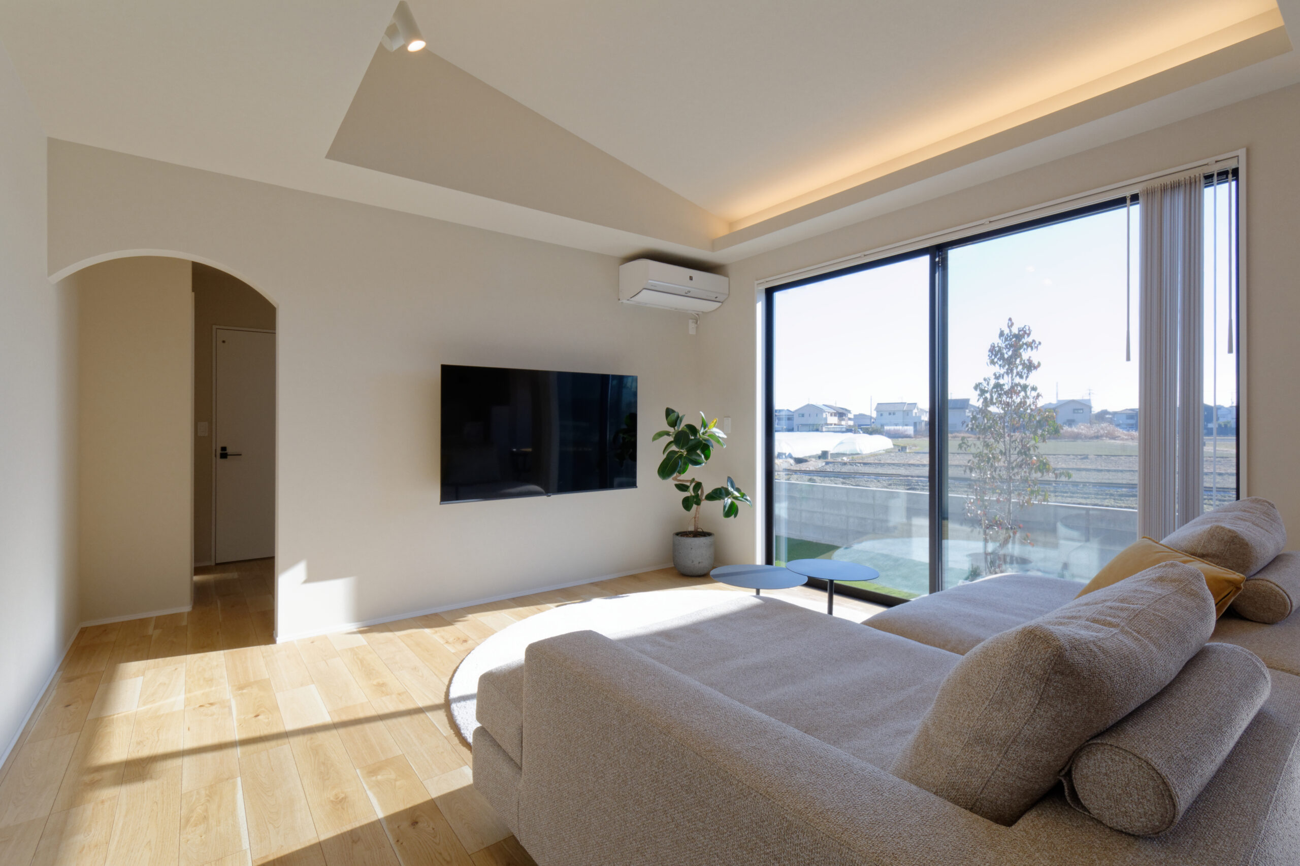 LDKの主役となっている、リビングに面した大きな掃き出し窓。外部とのつながりを感じられる大開口窓は、日中の採光を最大限に取り込み、照明に頼りすぎない暮らしを実現します。